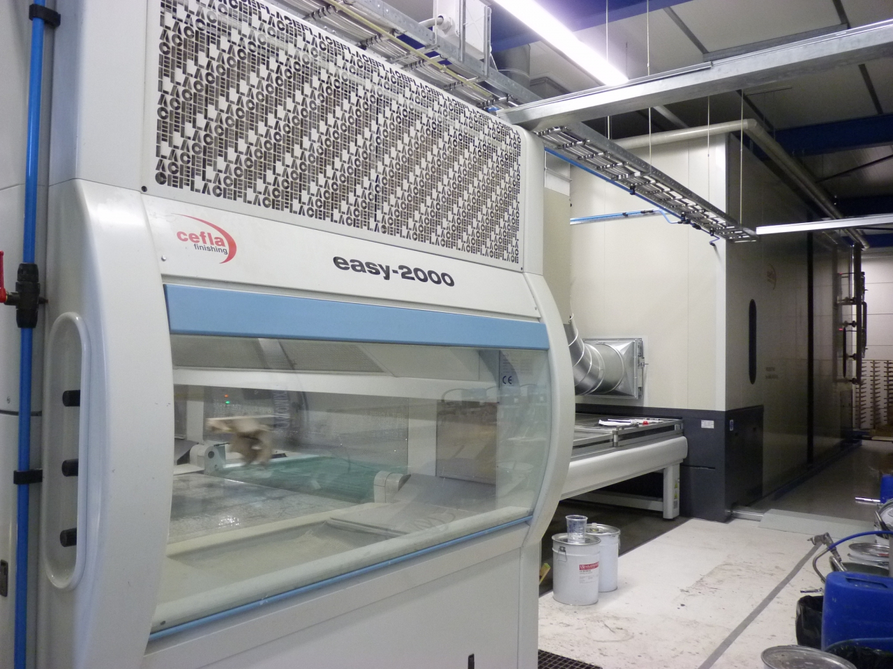 Eerst worden de te spuiten delen opnieuw geschuurd, dan stofvrij gemaakt en vervolgens gebeitst en geborsteld. Daarna komt het in de hypermoderne droogtunnel in het laatste deel van de straat en wordt bij gebruik van UV lak, op het einde van de straat de lak uitgehard met UV licht.